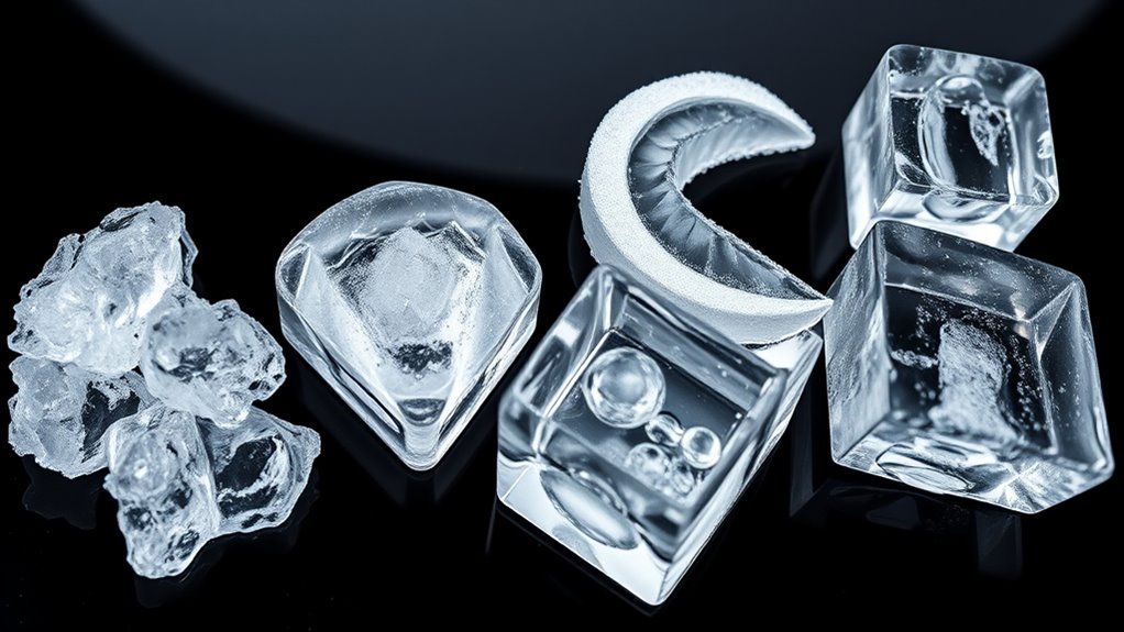 Nugget ice is small, soft, and chewable, perfect for beverages like sodas or cocktails, and it melts slowly. Crescent ice has a curved, half-moon shape that looks appealing and cools drinks efficiently. Clear and gourmet ice offer transparency and dense, large pieces that reduce melting and enhance presentation. Each type serves different purposes, whether for quick cooling, aesthetic appeal, or prolonged flavor. Keep exploring to discover how each can elevate your beverage experience.