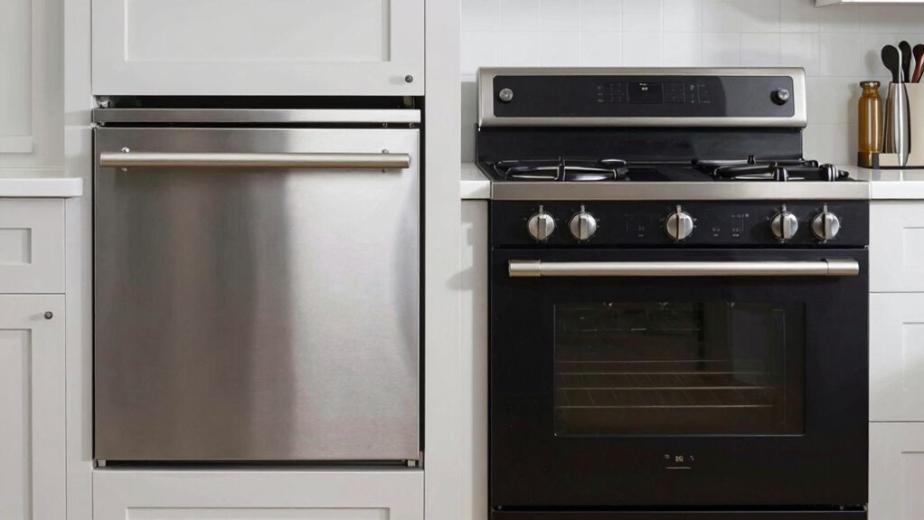 You’ll find slide-in ranges easier to clean because their flat top allows for more seamless oven cleaning, with fewer crevices to trap dirt. Freestanding ranges might require more maintenance tips, like regularly wiping down the surfaces and checking the oven seals. Both types benefit from routine oven cleaning to keep them in top shape, but slide-in models often have a sleek design that makes maintenance a little simpler overall.