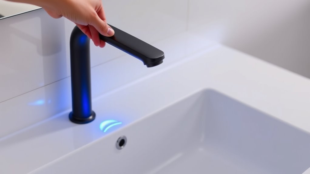 Water activation triggers in smart faucets rely heavily on ultrasonic sensors, which detect the presence of your hand or object nearby. These sensors emit high-frequency sound waves and analyze the echoes reflecting back from objects. When your hand enters the sensor’s range, it causes a change in the reflected signals, prompting the faucet to turn on. To understand this better, consider: