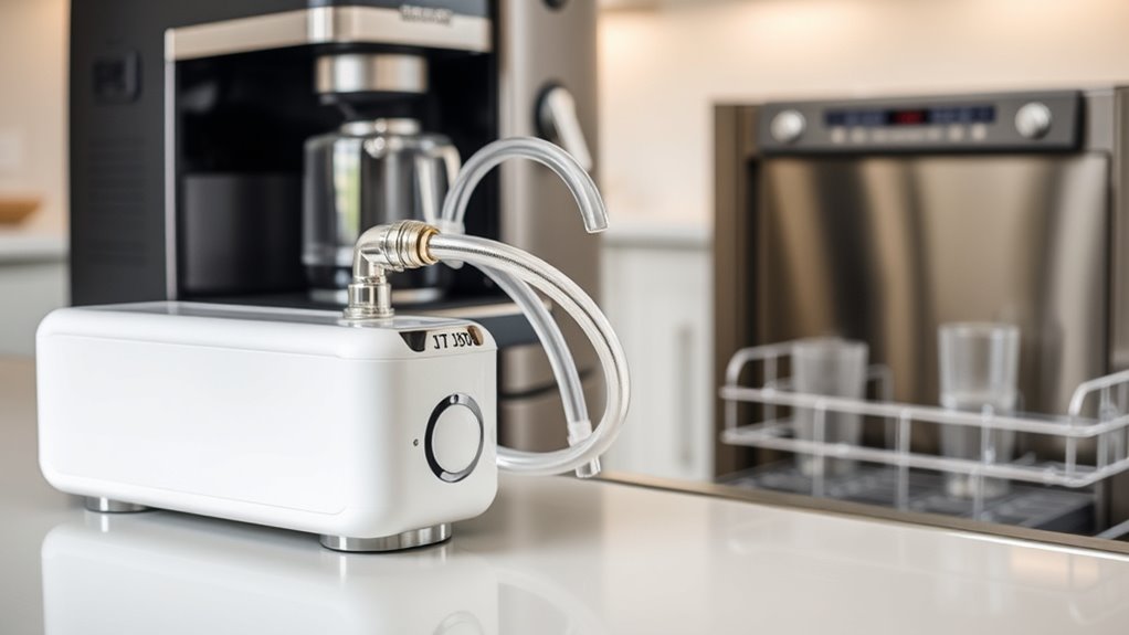Water softeners play a key role in protecting your appliances by removing minerals like calcium and magnesium that cause hard water. These minerals create scale buildup inside appliances, which hinders heat transfer and reduces efficiency. Softened water flows more freely, preventing scale formation and lowering appliance wear and tear. This helps your appliances last longer and work more effectively. Keep exploring to learn how water softeners truly benefit your household and save you money over time.