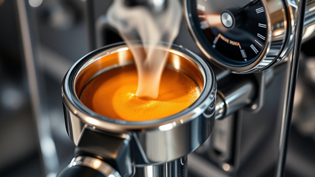 To craft the perfect espresso, you need to understand how pressure and temperature influence extraction. Proper pressure, around nine bars, pushes water through coffee grounds efficiently, ensuring rich flavor and proper crema. Temperature, typically around 90-96°C, helps extract desirable compounds without risking over-extraction or bitterness. Balancing these factors is vital for consistency and flavor. As you explore further, you’ll discover how mastering pressure and temperature can elevate your espresso to professional standards.