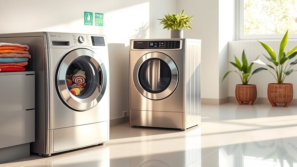 Switching to a heat pump dryer can cut your energy bills by up to 50%, saving you money over time. These dryers recycle heat, operate at lower temperatures, and use smarter sensors, making them more efficient than traditional models. They also help preserve your clothes and reduce environmental impact. If you want to discover how much you can save and the additional benefits, there’s more to explore below.