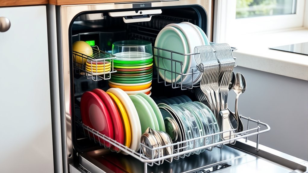 Yes, you can use eco mode with delicate or plastic items, but verify your dishwasher’s plastic safety and delicate cycle compatibility first. Eco mode typically uses lower water and energy, which is gentle enough for most plastics and delicate dishes. However, some plastics might still be at risk if they aren’t marked dishwasher-safe. Always follow manufacturer guidelines to protect your items and ensure effective cleaning.