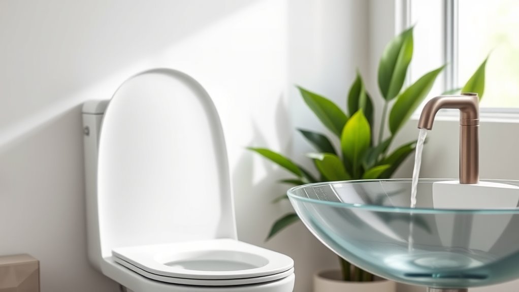 Switching to dual-flush toilets and low-flow fixtures helps you save water and reduce costs while supporting environmental sustainability. These eco-friendly options cut your water use without sacrificing performance, easing strain on municipal systems and lowering your bills. They also promote responsible water management in your home, making your property more efficient and eco-conscious. Want to discover more ways these fixtures benefit your household and the environment? Keep exploring to learn all the advantages.