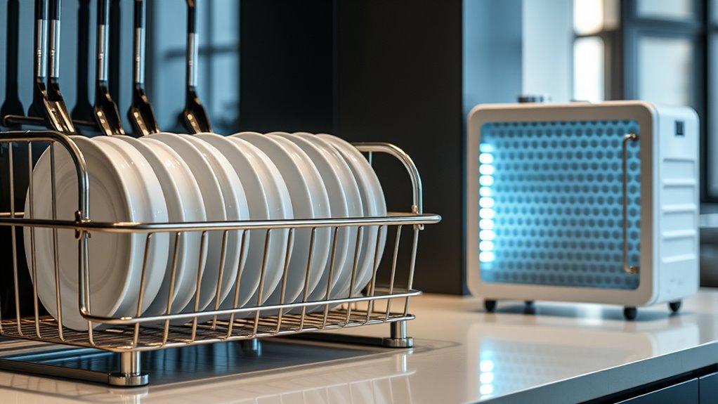 Advanced dish drying uses zeolite and heat-exchanger methods to boost efficiency and drying speed. Zeolite absorbs moisture and releases heat naturally, while heat exchangers recover exhaust heat to preheat incoming air. Combining these technologies creates a continuous, energy-saving drying process that’s gentle on delicate items and reduces energy costs. This innovative approach minimizes water and electricity use. If you stay tuned, you’ll discover how these systems work together for ideal results.