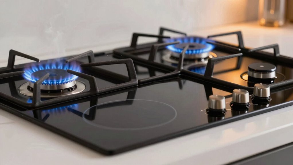 You need to regularly inspect and clean your gas range’s fuel line to prevent blockages and guarantee safety. A thorough cleaning routine involves wiping down burners and surfaces to remove grease and debris. For induction cooktops, maintenance is minimal—just keep the glass surface clean with a damp cloth. Unlike gas ranges, induction doesn’t require checking fuel lines, making it easier to maintain with less frequent upkeep.