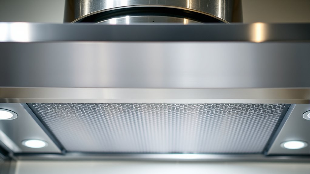 If you want better air purification, choosing the right filters is vital. You should look for high-efficiency particulate air (HEPA) filters, which trap tiny particles, or activated carbon filters that absorb odors and gases. These filters considerably improve your indoor air quality. Don’t settle for the standard—invest in advanced filter selection to guarantee your vent hood effectively reduces pollutants and keeps your air clean and healthy.