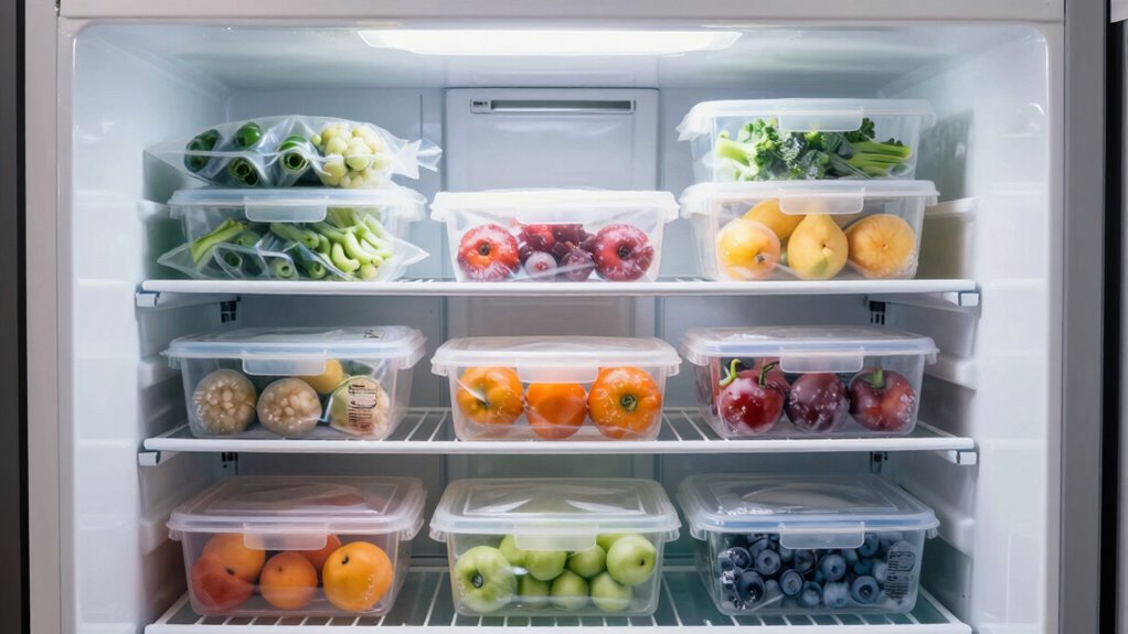 Start by grouping similar items together and labeling everything clearly. Use sturdy, airtight containers or vacuum-sealed bags for your meals and ingredients. When you package your food, remove as much air as possible from bags, which helps prevent freezer burn and preserves flavor. Stacking these containers efficiently will maximize your space, making it easier to see what you have at a glance. Think vertically—use stackable bins or shelves to keep items organized and accessible. This approach helps prevent overstuffing, which can restrict airflow and lead to uneven freezing or freezer burn.