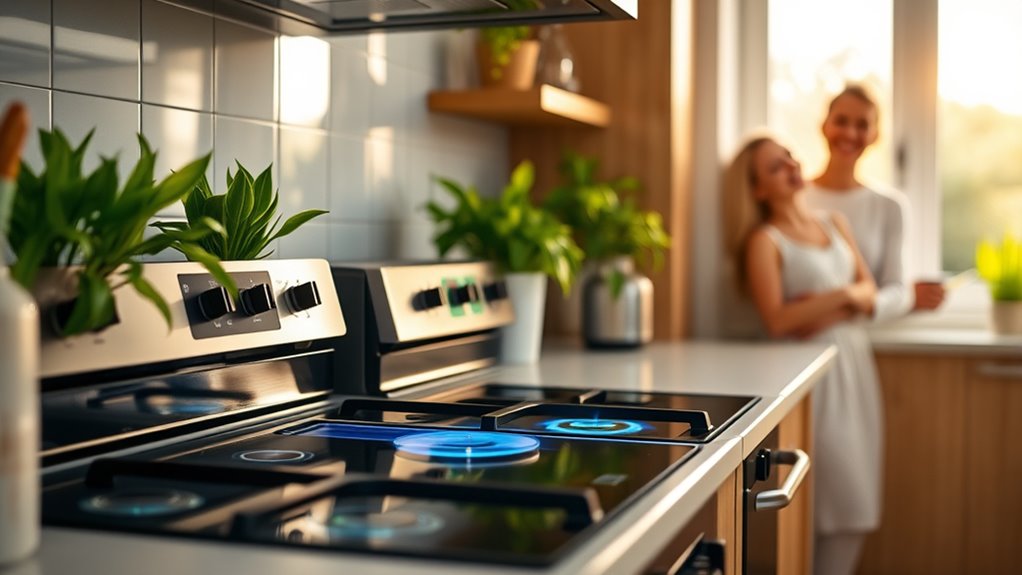 Switching to electric stoves improves your indoor air quality by eliminating harmful emissions like nitrogen dioxide, which can cause respiratory issues. It also lowers your household’s carbon footprint, especially if the electricity comes from renewable sources. Electric stoves require less maintenance and create a safer cooking environment. If you wanna learn more about how this change benefits your health and the environment, keep exploring the advantages of making the switch.