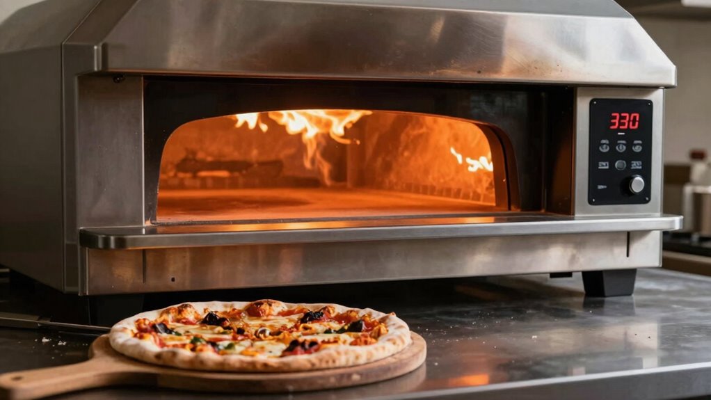 Preheating your pizza oven is a critical step to guarantee perfectly cooked pies, but knowing the right preheat times can be confusing. One key factor is understanding how to maximize stone baking, which is essential for achieving a crispy crust. When you use a pizza stone, it needs to be heated thoroughly to transfer heat evenly to your dough. Typically, allowing the stone to heat for at least 30 minutes at high temperatures—around 500°F to 550°F—is recommended. This ensures the stone becomes evenly hot, mimicking a traditional pizza oven’s floor, and prevents soggy or undercooked crusts. Keep in mind, the size and material of your stone influence heating time; thicker stones may require more time to reach ideal temperatures. Proper preheat duration is vital to ensure your stone reaches the necessary heat for optimal baking. Temperature calibration also plays a pivotal role in preheating. Many home ovens aren’t perfectly accurate, which can lead to inconsistent results. To avoid this, use an oven thermometer to verify your oven’s temperature settings. Once calibrated, you’ll have a better idea of how long to preheat and what temperature to set. For stone baking, it’s best to set your oven slightly higher than your target temperature if you know your oven runs cool. This way, the stone reaches the ideal heat for baking pizza without risking undercooked or burnt crusts. Regular calibration ensures that your oven’s displayed temperature matches the actual heat inside, giving you confidence that your pizza will turn out just right. Preheating isn’t just about reaching a certain temperature; it’s about doing so evenly. When you turn on your oven, give it ample time to stabilize at the desired heat, especially when using a stone. Proper preheat time allows the stone to absorb maximum heat, which is essential for creating that perfect crust. If you rush this process and start baking too soon, your pizza might stick to the stone or cook unevenly. Conversely, over-preheating can also cause burning, so sticking to recommended times based on your oven and stone type is key. Remember, patience during preheating pays off by producing that beautifully crisp, evenly cooked crust you’re aiming for.