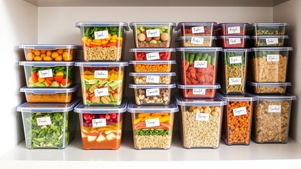 Meal prepping can save you time and reduce stress during busy weekdays, especially when you use freezer-friendly containers. These containers make it easy to organize your ingredients and meals in a way that keeps everything fresh and accessible. Proper ingredient storage is essential; by dividing your meals into individual portions, you minimize waste and guarantee each serving stays flavorful. When you portion out your food into freezer-friendly containers, you also gain better control over your intake, which can support healthier eating habits and prevent overeating.