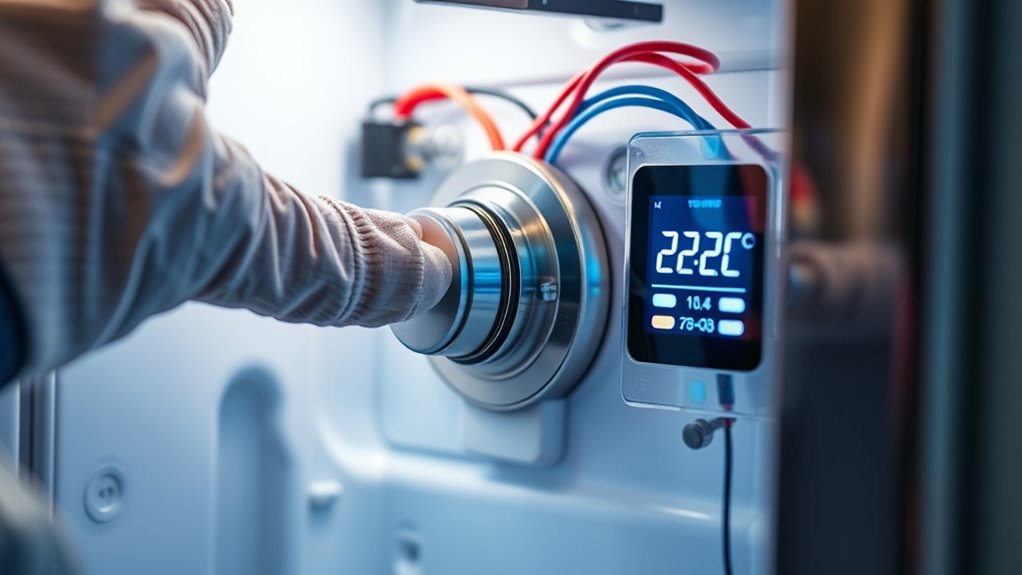 If your fridge’s temperature feels inconsistent or too warm despite setting adjustments, your thermostat might be faulty. You’ll notice the interior temperature doesn’t match the display, or the compressor runs constantly or too infrequently. Food spoils faster or freezes unexpectedly. Also, if the thermostat dial or control isn’t responding, it’s a sign you need calibration or replacement. Conducting a multimeter test can confirm if the thermostat’s signals are accurate.