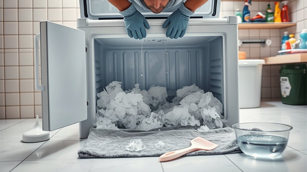 To defrost and clean your chest freezer, first unplug it and remove all food, storing it in a cooler. Open the lid and let ice melt naturally or use hot water to speed up the process, avoiding sharp tools. Gently remove large chunks with a plastic spatula and wipe away residue with a mild soap solution. Keep the interior dry and clean, check door seals, and then plug it back in. For more detailed steps and tips, keep exploring how to maintain your freezer effectively.