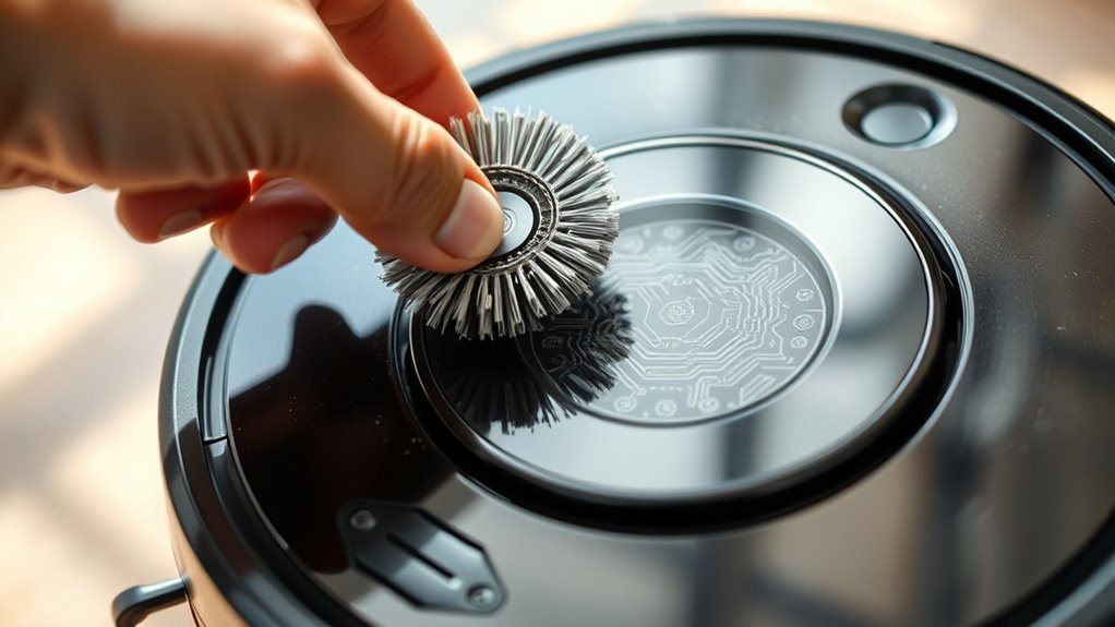 When it comes to brush cleaning, you should regularly remove hair, string, and debris tangled around the brushes. These obstructions can prevent the brushes from spinning freely, reducing their efficiency and increasing motor load. Use a small tool or your fingers to carefully detach any tangled material, and check for wear and tear. Replacing worn brushes ensures your vacuum maintains strong suction and effective cleaning power. Sensors, on the other hand, are indispensable for navigation and obstacle detection. Dust and dirt can obscure these sensors, causing your vacuum to misjudge distances or bump into furniture. Wipe the sensors gently with a soft, lint-free cloth to keep them clean and functioning properly. This simple step prevents unnecessary collisions, which can prematurely wear out parts and lead to more frequent battery drain due to inefficient navigation.