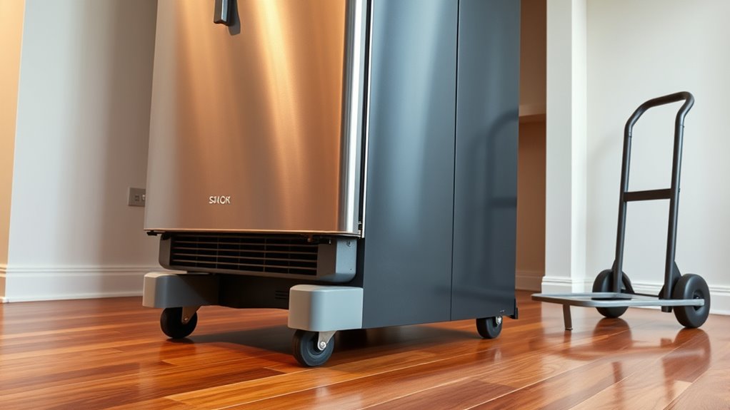 Using the right dollies and sliders can make appliance transportation safer and more efficient. Start by choosing appliance dollies with high load capacity, sturdy steel frames, and locking ratchets to secure your appliances. Use 5-wheeled dollies or roller sliders to distribute weight evenly, reducing tipping risks and ensuring smoother movement on uneven surfaces. Adjust the height of your dollies to lift appliances with high legs, making loading easier. Always secure appliances with straps to prevent shifting during transit. Maintain steady, controlled force while rolling to keep everything balanced. For long or awkward items, support both ends with two dollies. Opt for rubber-coated surfaces and industrial caster wheels to prevent floor damage and improve mobility. Prioritize safety features like locking wheels to avoid accidents during transport. Incorporating proper handling techniques can further enhance safety and efficiency during appliance moves. Additionally, selecting appliance-specific dollies designed for particular weight and size ensures optimal stability and reduces the risk of damage or injury.