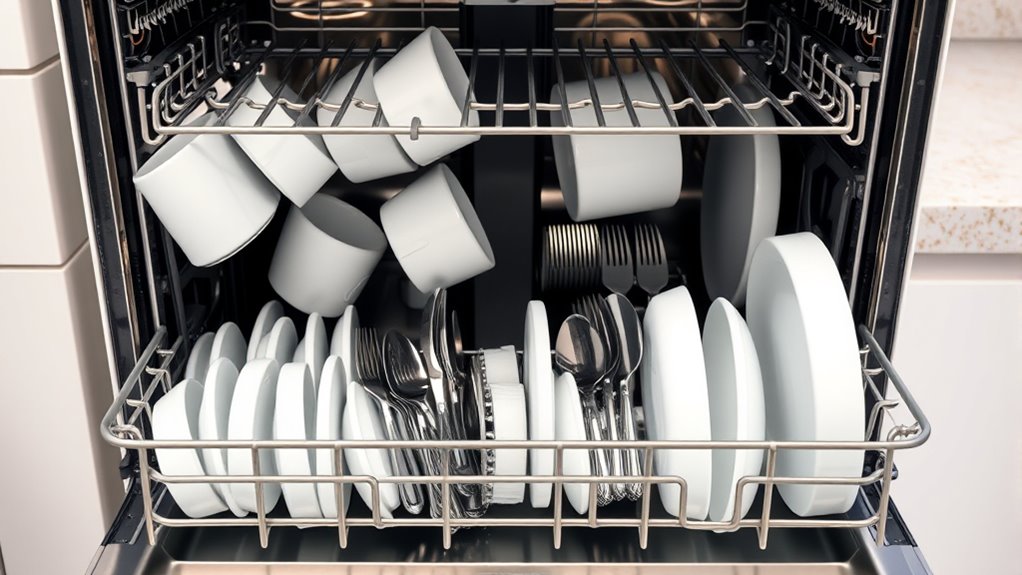 Your dishwasher might be screaming for help if dishes come out with leftover food or a film, or if spray arms are blocked by tall or clustered items. Overloading causes water to pool, and uneven cleaning indicates poor water flow. Leaks, standing water, or strange noises also signal improper loading. When dishes are shoved too tightly, water can’t circulate properly, turning your dishwasher into a noisy, inefficient mess.