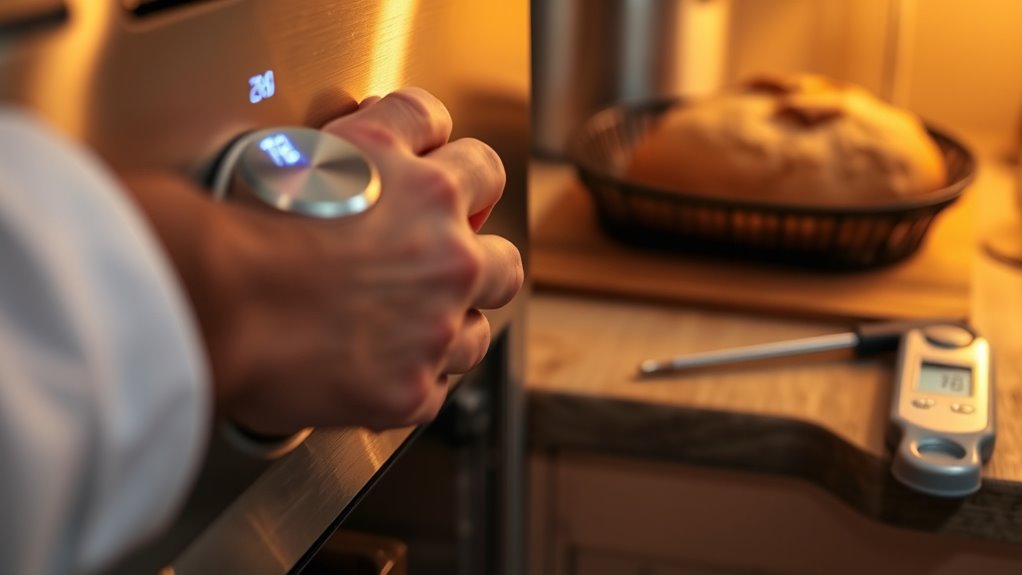 To recalibrate your oven for accurate baking, start by placing an oven thermometer in the center and preheat to your usual temperature. Compare the thermometer to the oven dial—if there’s a difference, check your user manual for specific adjustment instructions. Make small tweaks, then recheck until the oven temperature matches the thermometer. Regular calibration guarantees consistent results; keep exploring to find detailed steps tailored to your oven model.