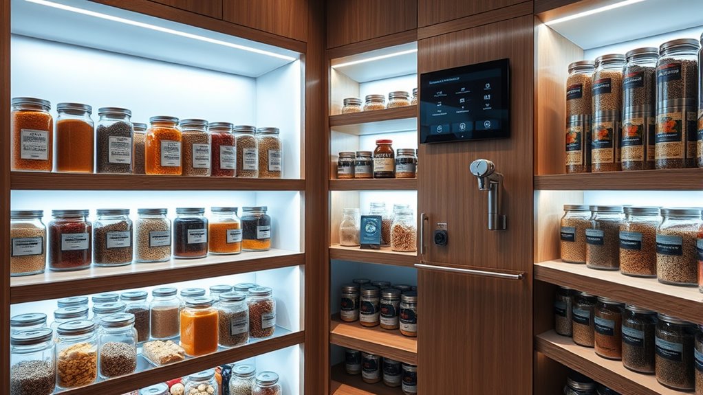 Sure, your smart pantry’s system can surprisingly suggest recipes based on your inventory, making meal planning a breeze—who knew technology could anticipate your cravings? It uses inventory-based meal planning to recommend dishes tailored to what you already have. So, instead of last-minute runs to the store, you get clever recipe suggestions, saving time and reducing waste. Now, your pantry’s smarter than your dinner plans!