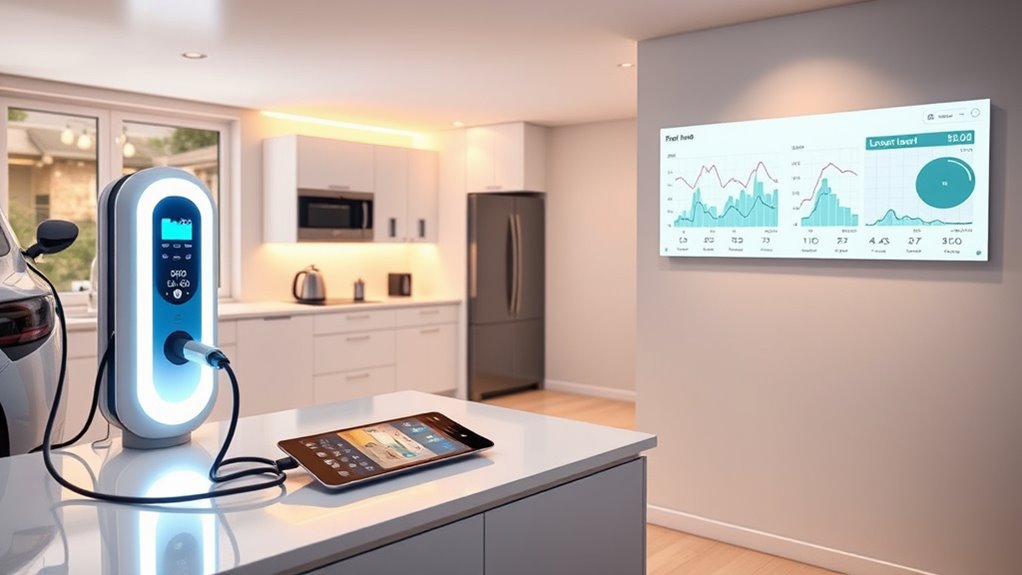 Load management improves safety during simultaneous appliance use and EV charging by continuously monitoring your home’s electrical load. It detects overloads or surges and dynamically redistributes power, preventing circuit overloads and breaker trips. This real-time adjustment keeps your wiring safe, reduces fire risks, and guarantees appliances and your EV charge efficiently without damaging your electrical system. By adhering to safety standards, it also minimizes electrocution risks and prolongs your system’s lifespan.