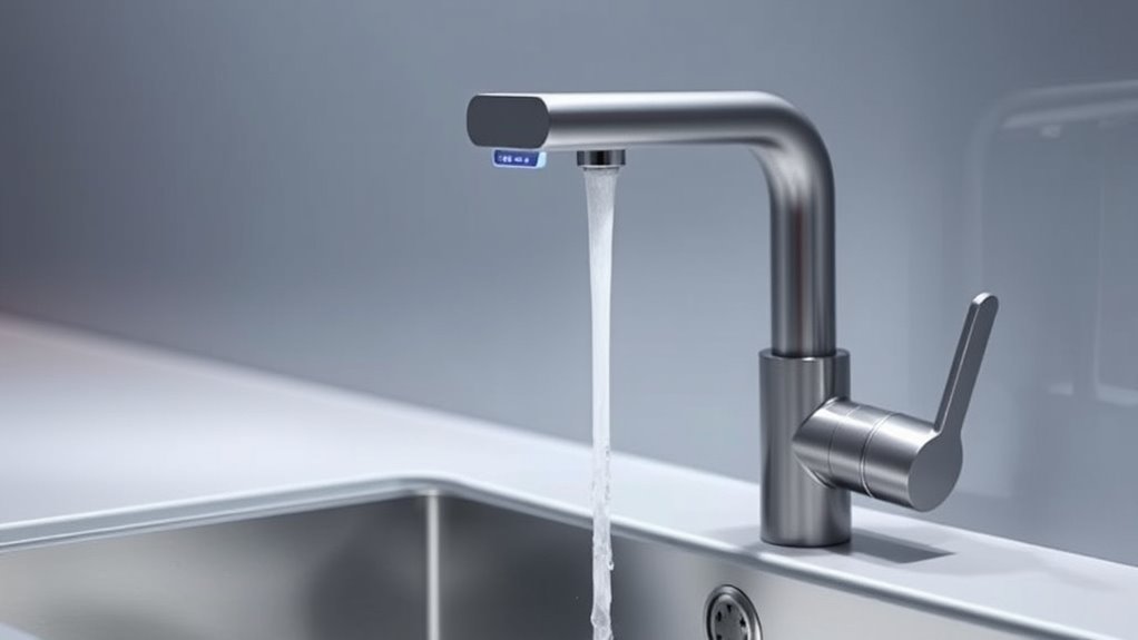 Smart faucets are transforming how we conserve water by integrating technology that automatically detects usage and adjusts flow accordingly. When you walk up to the sink, sensor technology activates the faucet instantly, eliminating the need to turn handles or knobs. This hands-free operation not only promotes hygiene but also guarantees water isn’t wasted when you forget to turn off the tap. With precise sensing, the faucet releases just the right amount of water you need, reducing excess flow and preventing unnecessary waste. As you finish, the sensor detects your presence leaving the area and stops the flow immediately, avoiding drips or leaks that often happen with traditional faucets. This seamless automation encourages mindful water use without sacrificing convenience.