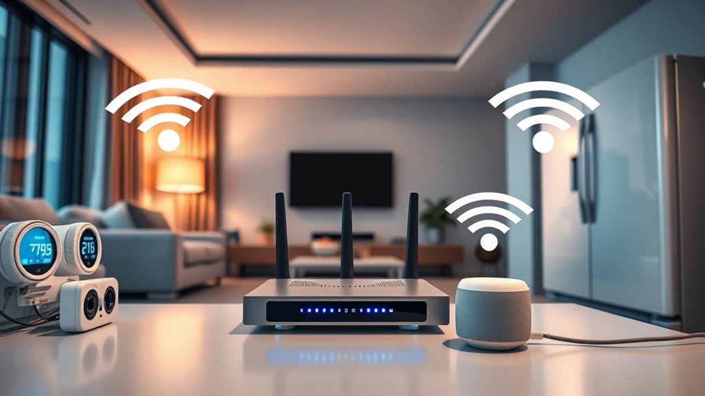 You should look for Wi-Fi standards like 802.11ac or 802.11ax, as they offer faster speeds and better reliability for smart appliances. Devices often operate on 2.4 GHz or 5 GHz frequency bands; 2.4 GHz offers wider coverage, while 5 GHz provides higher speeds. Opt for dual-band routers to guarantee your smart appliances connect seamlessly, reducing latency and improving overall performance.