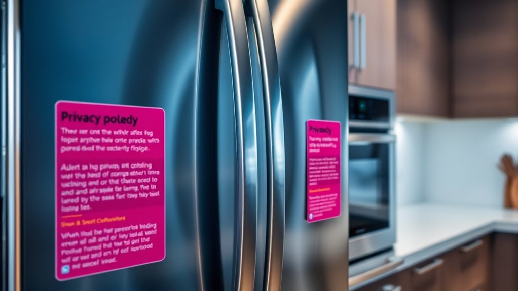 Understanding privacy labels is essential because they reveal what your connected appliances are doing behind the scenes. These labels disclose whether your device collects personal or anonymous diagnostic data, specifying types like power status, cycle details, or filter information. More invasive data, such as ZIP codes, phone numbers, or geolocation, may also be included, especially via linked smartphone apps. Privacy labels highlight if data is shared with third parties or tracked by embedded sensors in apps. They provide details about opt-in or opt-out options, giving you control over your information. Additionally, labels list all sensors, such as audio, video, motion, or environmental ones, alerting you to potential privacy risks. This transparency helps you understand how your appliance gathers and handles your data and the increasing prevalence of IoT devices amplifies these privacy concerns. Being aware of data collection practices empowers you to make informed decisions about your connected appliances. Recognizing the types of data collected can further help you assess the potential privacy implications of your devices.