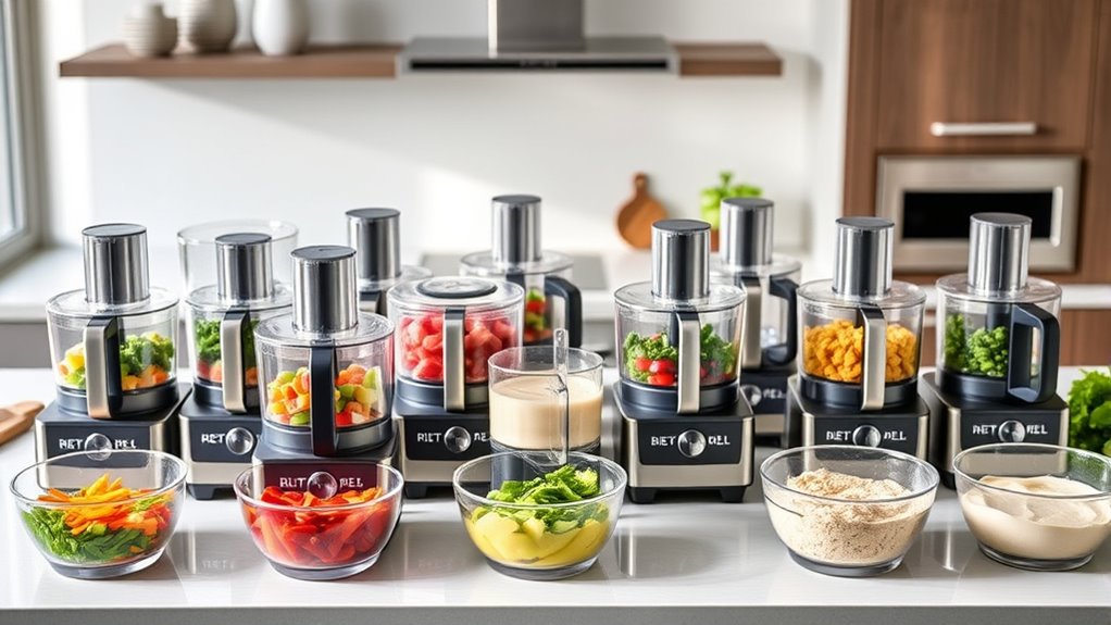 Choosing the right blade and disc options can considerably boost your food processor’s versatility, allowing you to tackle a variety of prep tasks with ease. Multiple blades and discs, such as shredding, slicing, chopping, and julienne attachments, help you handle everything from shredded cheese to vegetable sticks effortlessly. If customization matters to you, opt for models with adjustable blades rather than fixed discs, so you can fine-tune thicknesses. Some processors even come with specialized discs like French fry cutters or julienne blades, expanding their functionality beyond basic chopping. Compatibility with the work bowl and ease of changing accessories also influence convenience and efficiency. Ultimately, investing in high-quality blades made of stainless steel or reinforced drive shafts ensures durability and consistent results over time.