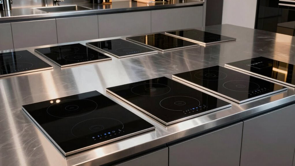 Material durability and finish are critical factors that directly impact the longevity and appearance of your 36-inch induction range. I recommend choosing materials with a Mohs hardness rating of 7.5 or higher, like nanotechnologically engineered anti-scratch glass, for superior durability. Finishes such as stainless steel and matte coatings resist fingerprints, oil buildup, and reflections, keeping the range looking clean over time. A durable cooktop surface should resist scratches, chips, and heat damage to ensure long-lasting performance. High-quality finishes are designed to withstand frequent cleaning with non-abrasive products without losing their aesthetic appeal. Additionally, selecting corrosion-resistant materials, like real metal brass knobs and stainless steel, can remarkably enhance the overall durability and lifespan of your range.