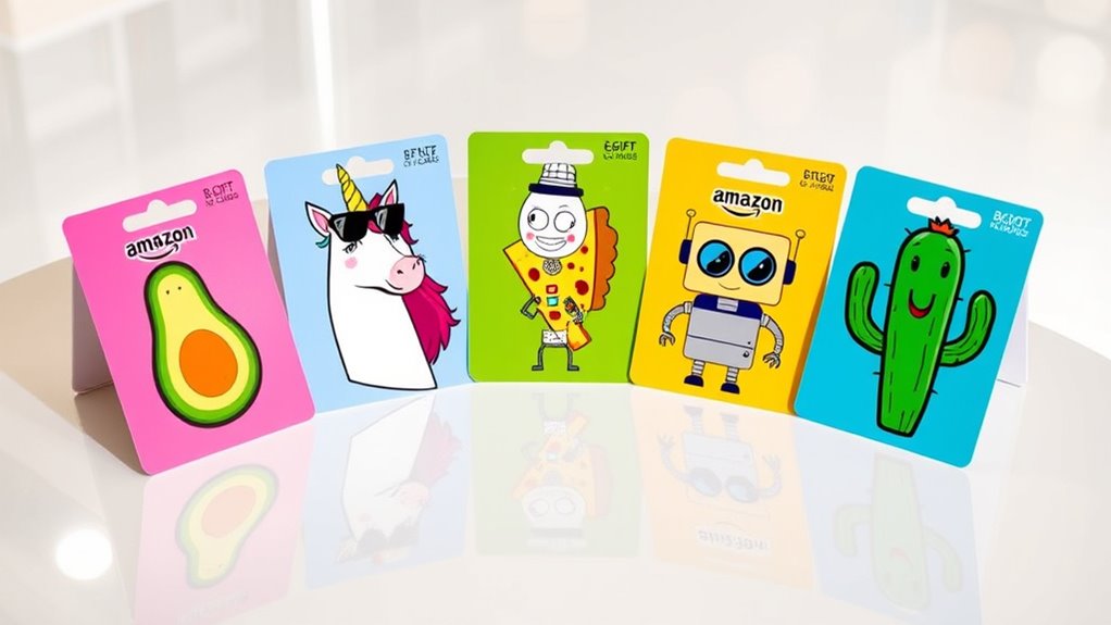 Choosing the right funny Amazon E-Gift Card design involves considering how well it can be personalized to match the recipient’s personality and sense of humor. Personalization options vary widely; some designs let you add custom messages, images, or jokes that reflect their unique taste. This makes the gift more meaningful and memorable. You can often select font styles and colors to suit the recipient’s preferences or the occasion, enhancing the overall effect. Some designs offer extensive customization, while others stick to pre-made humorous templates. By choosing a design that allows personalization, you can craft a gift that feels tailored and thoughtful, making it more than just an ordinary gift card. Personalization truly amplifies the fun and emotional impact of your present.