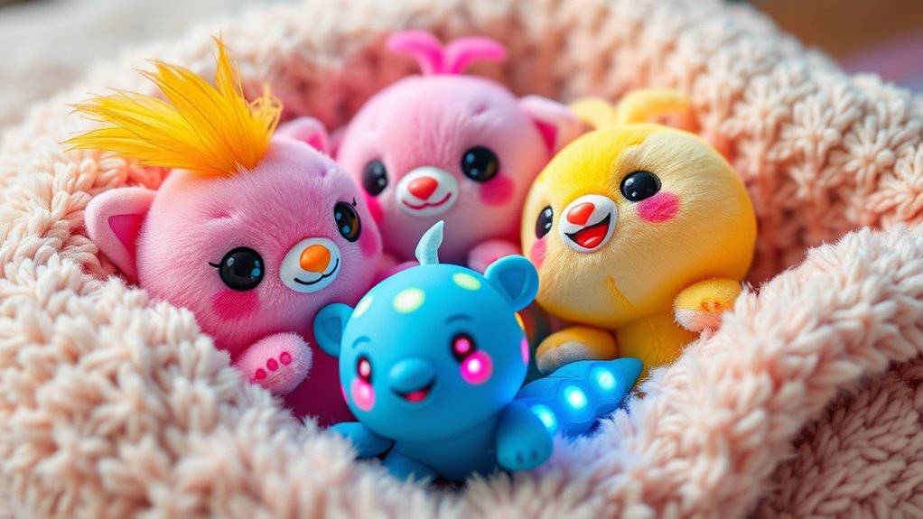If you’re looking to brighten your child’s day, I recommend three fantastic Bitzee digital pets. The JCHPINE Silicone Cover Case offers durable protection and a cute Disney design, perfect for on-the-go fun. The Silicone Case for Bitzee provides a snug, impact-resistant fit, great for active play. Finally, the Bitzee Magicals interactive animal toy features 20 adorable creatures with reaction sounds and games to keep kids entertained. Keep exploring to discover which one suits your child’s favorite play style best.