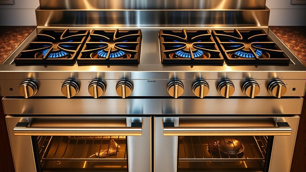 Cooking technology features play a essential role in how effectively your double oven gas range performs. Convection technology, for example, uses fans to circulate hot air, ensuring even cooking and baking across multiple racks. Precise heat control is also critical; models often have multiple burners with adjustable BTU outputs, giving you versatility for various cooking techniques. Some ranges combine electric convection ovens with gas burners, offering the benefits of both technologies. Advanced features like fan-assisted or turbo convection further improve baking uniformity. When both ovens include convection, you can cook different dishes simultaneously at optimized temperatures, boosting efficiency. These innovative features help you achieve professional-quality results and make your cooking experience more precise and convenient.
