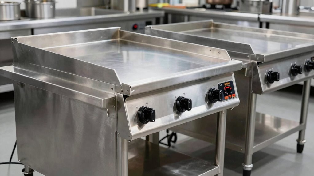 Cleaning and maintaining these griddles is surprisingly straightforward—if you enjoy scrubbing, that is. I just heat it up, scrape off the leftover bits with a metal spatula, and wipe it down with a damp cloth. Regular oiling keeps the surface non-stick and rust-free. Honestly, with a little routine, these units stay in top shape without much hassle, making cooking and cleanup a breeze.