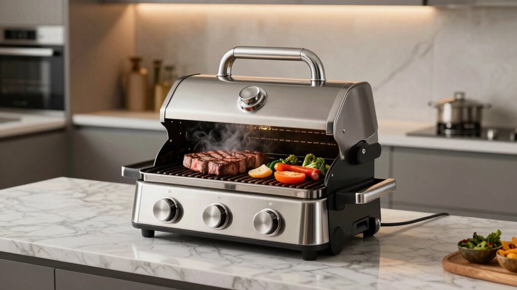Did you know that over 60% of indoor grill users prioritize safety features? I can tell you these grills definitely come with safety features for indoor use. They typically include automatic shut-off, temperature controls, and smoke extraction systems. These elements guarantee you’re protected from potential hazards like overheating or smoke buildup. So, resting assured, most top models are designed with your safety in mind, making indoor grilling both fun and secure.