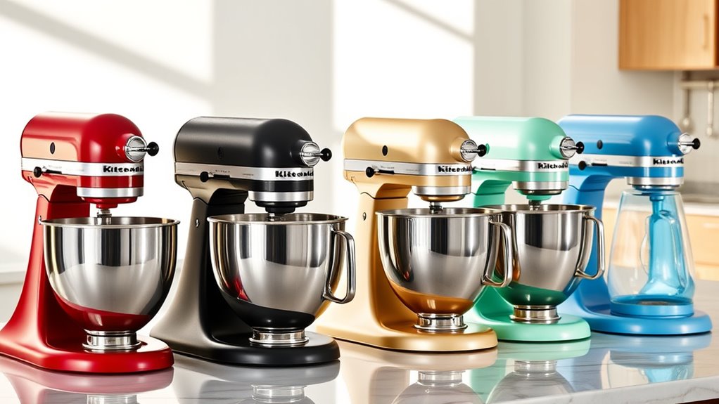 In 2025, the top KitchenAid stand mixer colors blend classic elegance with modern trends. Neutral tones like matte black and white remain timeless choices, fitting seamlessly into any kitchen. Bold hues such as deep blue or vibrant red add personality and excitement, while pastel shades like blush pink stay trendy for a fresh look. Choosing the right color depends on your style and space, and exploring more will help you find your perfect match.
