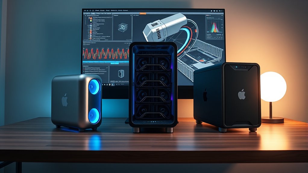 Thermal designs play a vital role in prolonged rendering tasks by managing heat effectively. When a system stays cool, it prevents thermal throttling, which slows down performance. I’ve seen that good cooling solutions, like advanced heat sinks and airflow management, help maintain consistent speeds during long renders. So, if you’re doing intensive work, choosing a machine with a solid thermal design guarantees your work stays efficient without overheating interruptions.