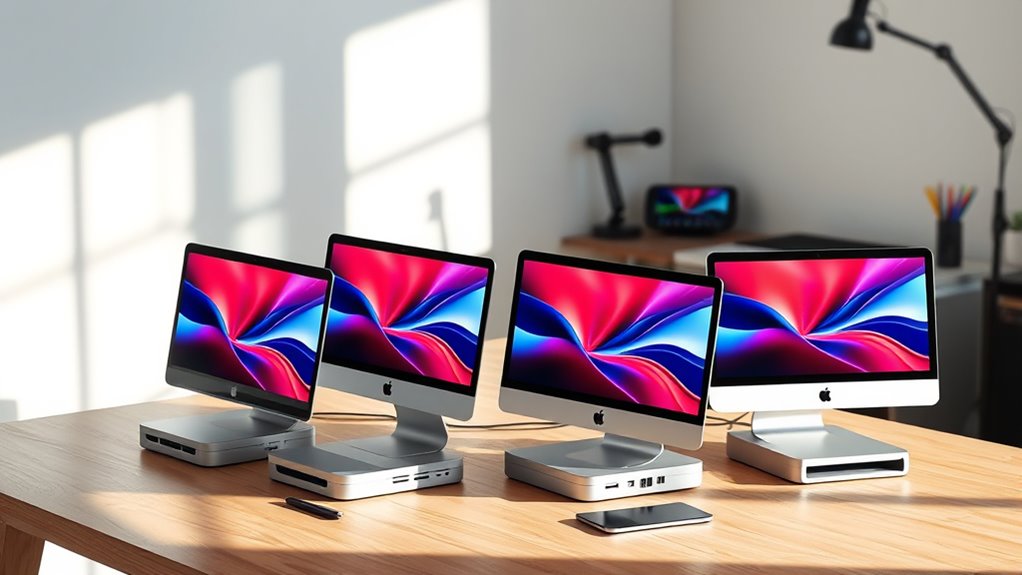If you’re evaluating the best Macs for 3D rendering in 2025, I recommend considering the Mac mini with M4 Pro for its top-tier CPU and GPU, and the 2024 Mac mini with M4 for solid performance at a lower price. The base M4 model is great for lighter tasks, while the more powerful options excel with demanding projects. Keep exploring further, and you’ll find the details needed to pick the perfect setup for your needs.