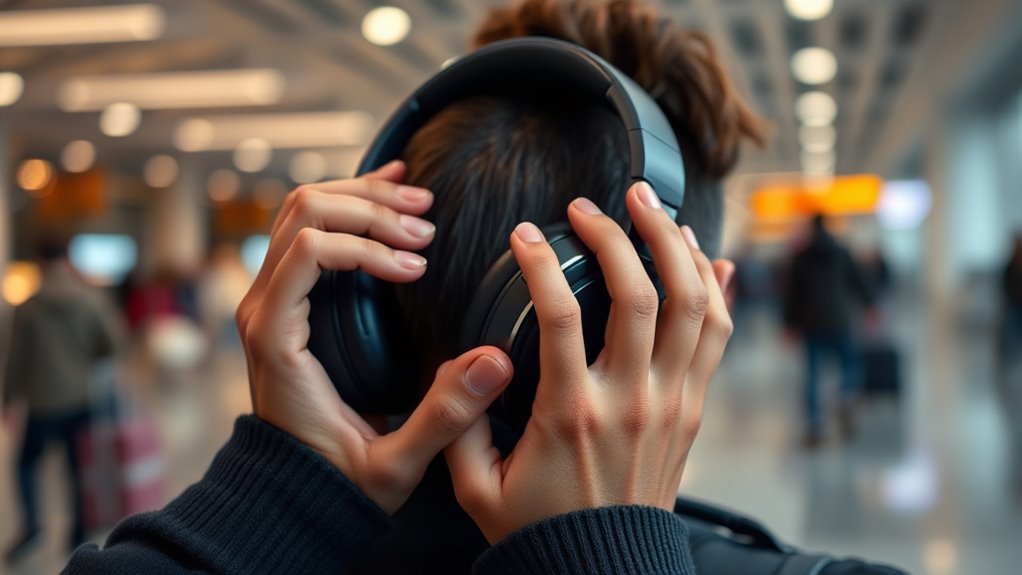 Have you ever experienced headphones slipping or causing discomfort during a long flight? That’s frustrating and can ruin your listening experience. When choosing noise-canceling headphones, comfort and fit are essential. Look for models with adjustable headbands and rotatable ear cups—they help guarantee a secure fit for different head sizes. Plush, memory foam ear cushions reduce pressure and make extended wear more comfortable. Lightweight and ergonomic designs prevent fatigue during long trips. Additionally, customizable noise cancellation modes allow you to optimize comfort based on your environment. The key is finding headphones that fit snugly yet gently—so they stay in place without squeezing too tight. Prioritizing these features guarantees a comfortable, enjoyable travel experience without distractions or discomfort.