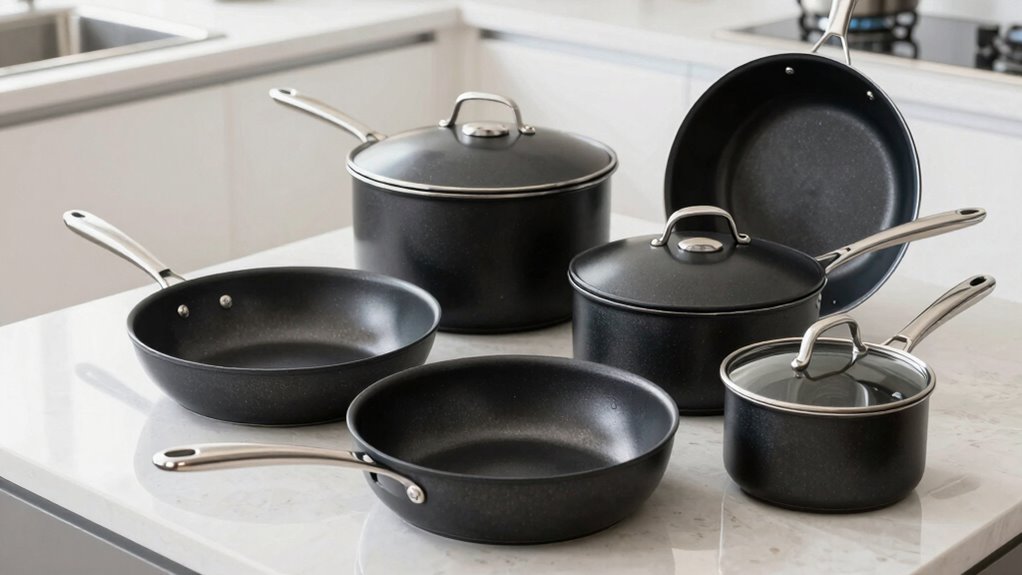 When choosing a PFOA-free nonstick cookware set, I focus on material safety standards and durability features to guarantee long-lasting performance. I also check for compatibility with my stovetop and how easy the pieces are to clean. Finally, I consider construction quality to make sure I’m investing in a reliable, safe set that meets my cooking needs.