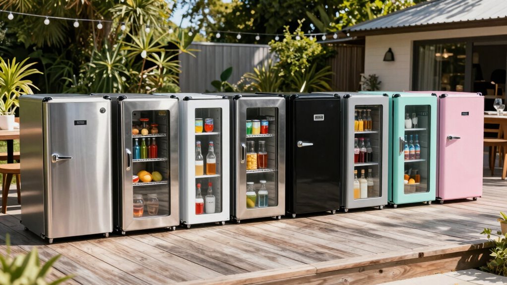 If you’re looking for the best outdoor-rated mini fridges for 2026, I recommend considering models like the 15-inch beverage cooler with French doors, the 21-inch stainless steel option, and larger units that hold up to 180 cans. These refrigerators are built with weatherproof materials, corrosion resistance, and safety certifications to handle outdoor conditions. Keep in mind size, installation, and safety features to find the perfect fit. Stay with me to learn more about each option and which might suit your needs best.
