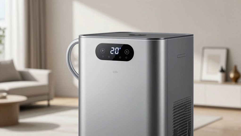 Dehumidification functions are a significant feature to contemplate when choosing a portable AC with an inverter compressor. These units can remove up to 95 pints of moisture daily, markedly improving indoor air quality. Maintaining ideal humidity levels, typically between 40-60%, helps reduce mold growth and dust mites, creating a healthier environment. Many inverter ACs include an auto mode that automatically switches between cooling and dehumidifying based on ambient humidity, ensuring comfort without manual adjustments. Self-evaporating systems further simplify maintenance by automatically discharging condensate, eliminating the need for manual drainage during dehumidification. Additionally, adjustable humidity settings and multi-speed fans enhance efficiency, allowing you to customize indoor conditions for maximum comfort and air quality.