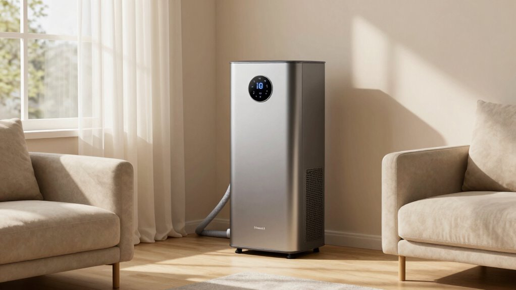 Choosing a portable air conditioner with heat that operates quietly can considerably boost your comfort, especially if you plan to use it during sleep or work hours. Noise levels typically range from 48 to 56 decibels, with quieter models around 48 dBA. Lower noise levels are vital for maintaining a peaceful environment, and many units include sleep modes that automatically reduce fan speed and noise overnight. Sound ratings in decibels allow you to easily compare units before buying. Quiet operation is achieved through sound-insulating materials, optimized fan designs, and inverter technology that minimizes motor noise. By prioritizing noise levels, you guarantee your space remains calm and comfortable, even during extended use or late-night hours.