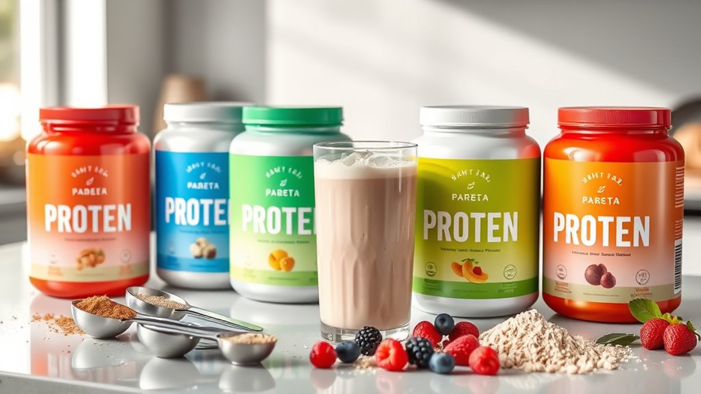Protein powders come in a wide range of prices, making it important to take into account your budget and how often you’ll use them. Cheaper options, like bulk powders, offer a good cost per serving and are ideal for regular use. Higher-end brands often include organic ingredients or specialty formulations, which come with a higher price tag but may offer better quality. Accessibility is another key factor—some powders are easy to find in local stores, while others require online shopping, which can impact convenience and delivery times. If you plan to use protein daily, investing in larger containers can save money over time. Ultimately, balancing cost, availability, and ingredient quality helps you choose the best option for your weight loss journey and lifestyle.