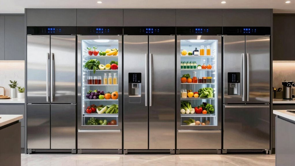 Energy efficiency is a vital factor to contemplate when selecting a smart French door refrigerator, especially since these models often come with advanced features that can impact power consumption. Look for appliances with ENERGY STAR certification, which guarantees they meet strict efficiency standards set by the EPA, helping you save on utility bills. Modern refrigerators use improved insulation, advanced compressor technology, and LED lighting to optimize energy use. Features like efficient fans and well-designed door seals prevent cold air loss, boosting overall efficiency. Regular maintenance, such as cleaning filters and checking seals, also plays a pivotal role in maintaining peak performance. Choosing a model with high energy standards not only benefits your wallet but also supports environmental sustainability.