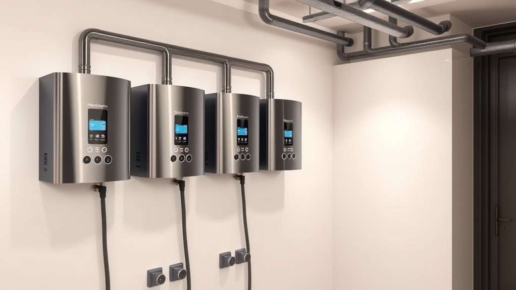 Regular maintenance is key to keeping your smart water heater with app control running efficiently and lasting longer. Descaling and inspecting for leaks are essential tasks that help prevent mineral buildup and identify issues early. Many models now include features like maintenance alerts or leak detection, making it easier to stay on top of servicing needs. Some units require minimal upkeep thanks to self-cleaning or anti-scale technology, reducing manual maintenance. Routinely checking the app-connected system can help catch malfunctions before they escalate. Following the manufacturer’s recommended maintenance schedule ensures your warranty remains valid and performance stays ideal. By staying proactive with maintenance, you’ll extend the lifespan of your heater and enjoy consistent, trouble-free hot water.