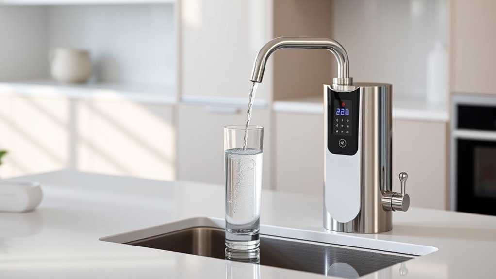 Tankless reverse osmosis systems are quite energy-efficient because they only operate when water is being used, unlike traditional systems that run continuously. I’ve found that they save energy and reduce waste, making them eco-friendly and cost-effective in the long run. Plus, their compact design means less power consumption overall. If you’re looking for a system that balances purity with energy savings, tankless RO units are an excellent choice.