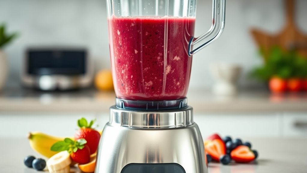 A powerful motor—typically above 1000W—is vital for effective vacuum blending because it enables higher RPMs and better oxygen removal. The increased power allows the blender to process ingredients quickly and efficiently, even dense or tough items, without overheating. Higher wattage correlates with faster blending speeds and more consistent vacuum pressure, which is essential for preserving nutrients and achieving a smooth texture. The motor’s torque and engineering quality also influence how well the vacuum system extracts air from the mixture, ensuring minimal oxygen exposure. Additionally, adequate power helps maintain performance over time, especially when tackling larger batches or harder ingredients. Overall, investing in a blender with robust motor strength ensures reliable, efficient operation and optimal oxygen removal.