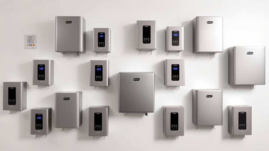 When it comes to ensuring comfortable and safe hot water throughout your home, temperature control features play an essential role. Digital displays and adjustable thermostats let me set precise temperatures, usually between 86°F and 140°F, ensuring I get exactly what I need. Advanced chip technology allows the unit to adjust heating power thousands of times per second, maintaining water within 1°F of the set point for consistent comfort. Some models offer user-friendly controls like knobs, touch panels, or remote WiFi apps, so I can easily monitor and change settings from anywhere. Built-in safety features such as temperature locks and over-temperature protection help prevent accidental scalding and keep operation safe. Fine-tuning the temperature also helps optimize energy use and reduces water wastage.