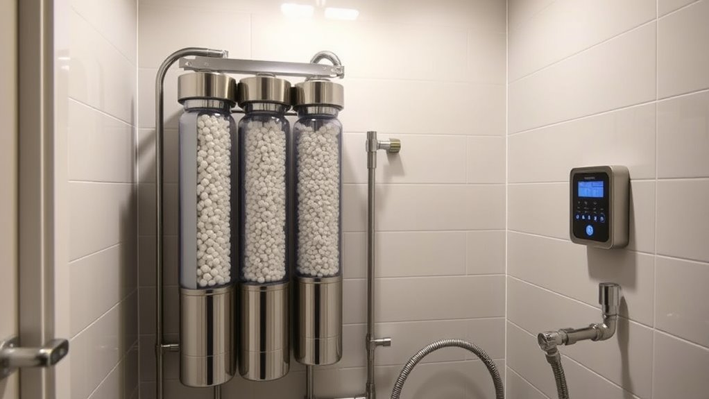 Maintaining your whole house filter and softener system is essential for guaranteeing it works effectively and lasts longer. Most systems require filter replacements every 6 to 12 months, depending on water quality and usage. Softener systems often need salt or regenerant added every 1 to 3 months. Some models feature automatic or metered regeneration, reducing manual effort but still needing regular monitoring and occasional servicing. Maintenance tasks may include cleaning or replacing pre-filters, inspecting resin beds, and checking control valves to ensure proper operation. Proper upkeep prevents issues like clogging, pressure drops, or bacterial growth, ultimately extending the lifespan of your system and guaranteeing ideal water quality. Staying on top of maintenance keeps your system functioning efficiently and saves you money in the long run.