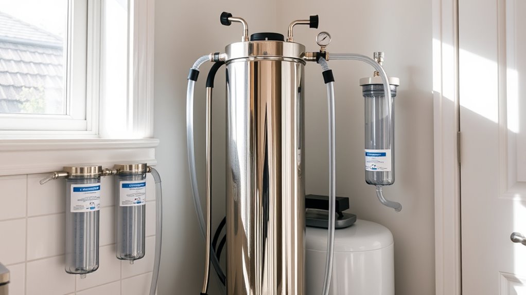 Think of your home’s water flow like a steady river—most whole house filtration units deliver around 10 to 20 gallons per minute. I’ve found that this flow rate balances enough pressure to satisfy daily needs without overwhelming the system. It’s like maintaining a gentle yet powerful stream, ensuring every faucet and showerhead gets a reliable supply of clean, safe water without sacrificing efficiency or performance.
