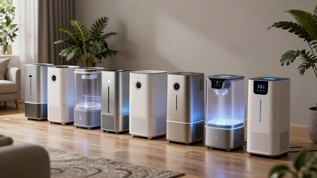 Think of choosing a humidifier console like finding the perfect garden sprinkler—you want it to nurture every corner without overwatering. With the right pick, your whole room becomes a lush oasis, cozy and balanced. So, consider your space and needs carefully. When you select wisely, it’s like planting seeds for better air quality—watch your home flourish with comfort and vibrancy, making every breath a invigorating breeze.